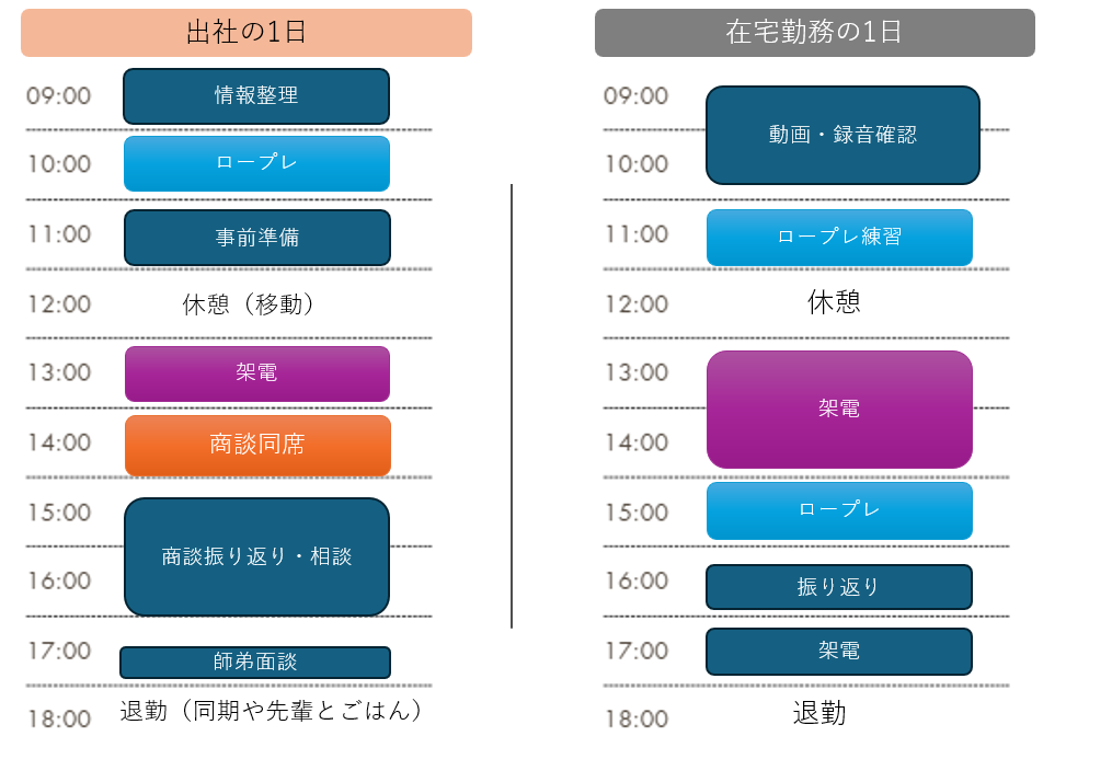 出社日は「打席に立つ日」として、商談や相談を積極的に行い、在宅勤務は「武器を磨く日」として、ロープレやインプットに集中しています。