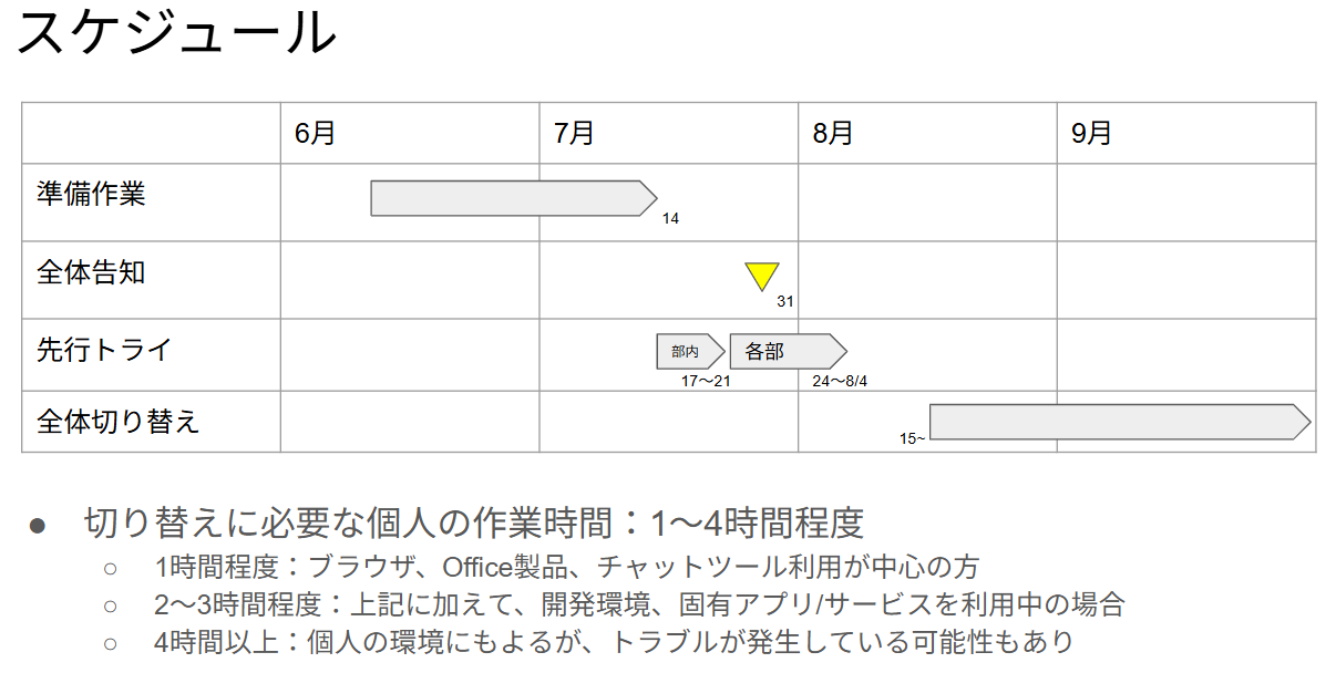 全体朝礼での頭出しも終わり、次は、具体的な切り替え手順の作成、先行トライを経て全ユーザーに切り替えを行ってもらう作業の本丸です。