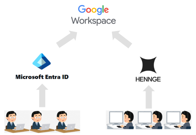 ここでお伝えしたいポイントは、Google Workspaceに対してIdpとしてHENNGEとEntraIDを共存させることができるということです。共存させながら切り替えていく手順をご紹介いたします。